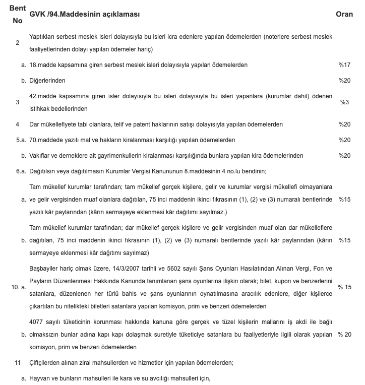 Pratik Bilgiler Gelir Vergisi Stopaj Oranları Diğer Pratik Bilgiler KDV'de Kısmi Tevkifat Tablosu İNCELE Gelir Vergisi Stopaj Oranları İNCELE Aylık ve Yıllık Enflasyon Oranları İNCELE Gelir Vergisi Tarifesi İNCELE 2022 Yılı Motorlu Taşıtlar Vergisi İNCELE Damga Vergisi Oran ve Tutarları İNCELE Vergiden İstisna Yurtiçi ve Yurtdışı Gündelik Tutarları İNCELE Değerli Kağıt Bedelleri İNCELE Diğer Bazı Oran ve Tutarlar İNCELE Engellilik İndirimi İNCELE Kıdem Tazminatı ve Sigorta Tavanları İNCELE Veraset ve İntikal Vergisi Oranları İNCELE Vergiden Müstesna Yemek Yardımı İNCELE VUK 2022 Yılı Hadleri ve Tutarları İNCELE 2022 Asgari Ücret İNCELE